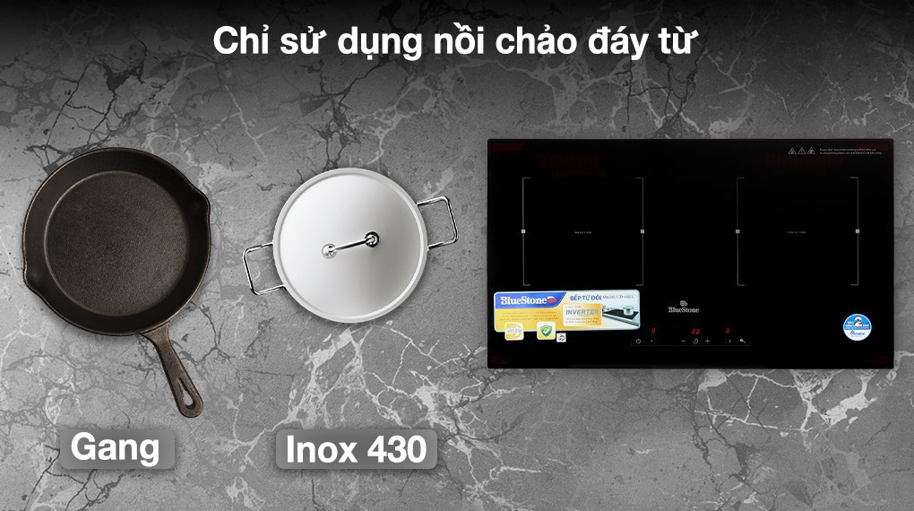 - Chỉ sử dụng nồi, chảo có đáy từ tính. Hãng khuyến cáo nên dùng nồi/chảo bằng gang, inox 430 các loại chảo/nồi đáy phẳng, đường kính đáy từ 12 cm sử dụng với bếp từ để đun nấu dễ dàng.