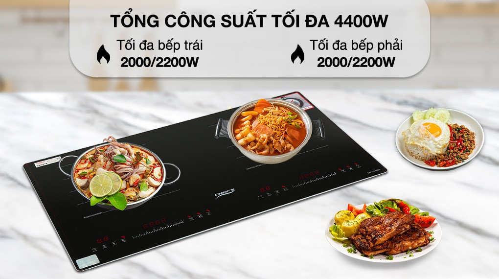 - Bếp từ đôi vận hành với tổng công suất 4400W.