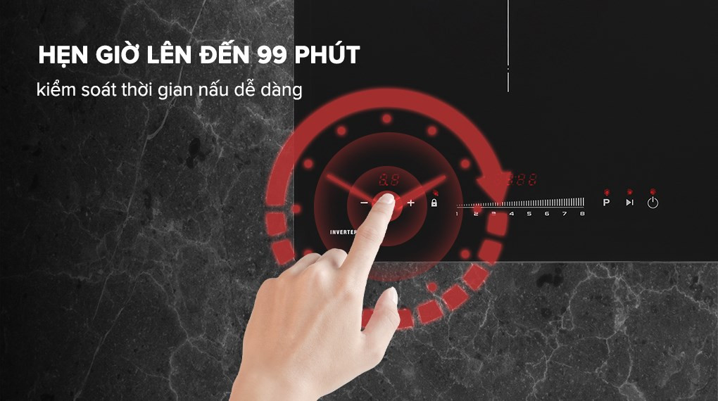 Không thể bỏ qua chức năng hẹn giờ tắt bếp trong khoảng 1 - 99 phút giúp người dùng tiện nấu các món ninh, hầm mà không cần canh chừng tắt bếp. Ngoài ra bếp còn sở hữu những tính năng an toàn giúp người dùng an tâm sử dụng: khóa bảng điều khiển, cảnh báo mặt bếp nóng, tự nhận diện kích cỡ đáy nồi, dừng bếp tạm thời.