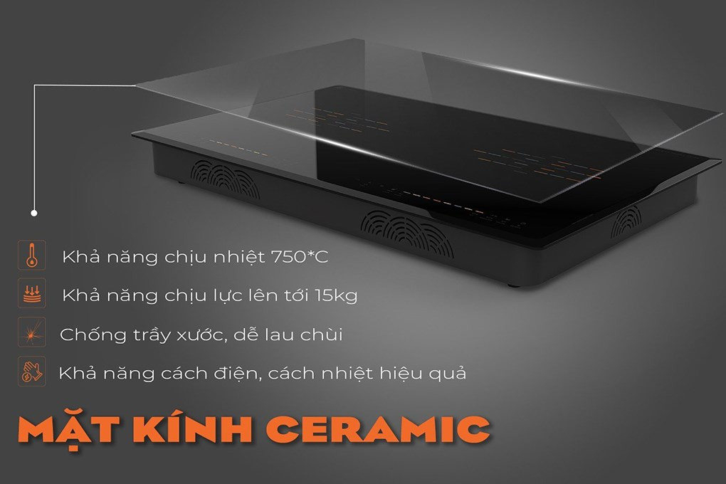 Không chỉ có vậy, kính Ceramic còn có khả năng chống xước, chịu lực lên tới 15 kg và chịu nhiệt khoảng 750°C hoàn toàn có thể yên tâm về độ bền. Bên cạnh đó, mặt bếp sáng bóng, sang trọng, dễ dàng vệ sinh để có ngoại hình bếp như mới.