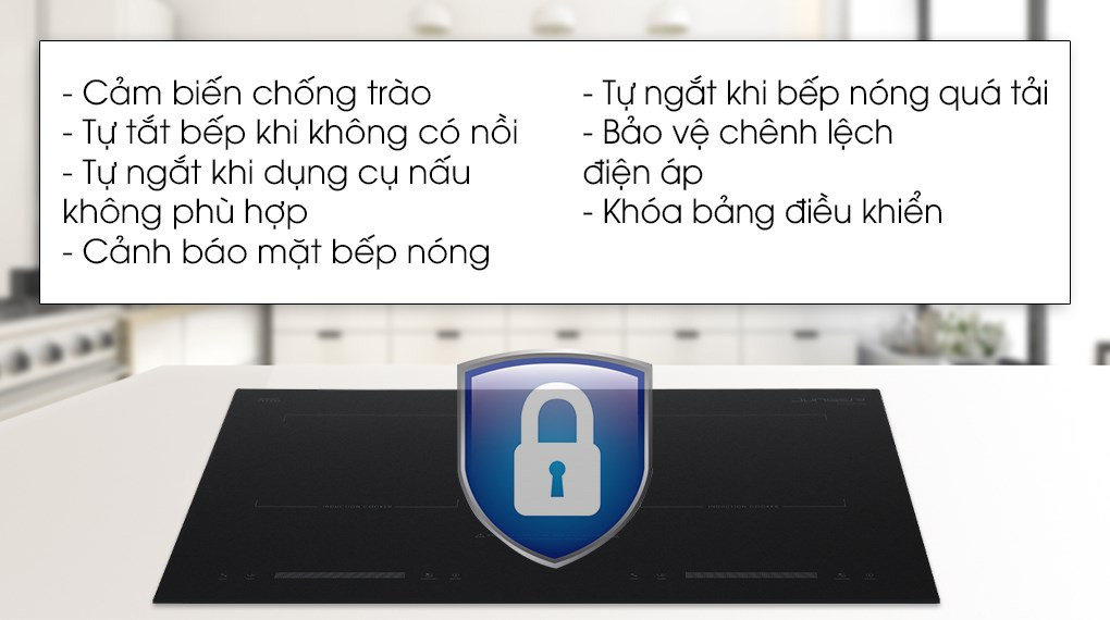 - Cảm ứng chống tràn: khi nước từ vật dụng nấu tràn ra ngoài, bếp sẽ phát âm cảnh báo và tự động ngắt bếp.