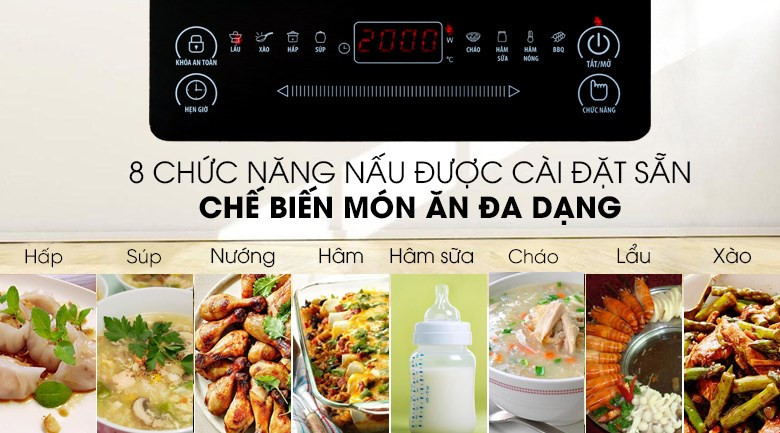 8 chế độ nấu tự động gồm nấu lẩu, xào, súp, hấp, hâm nóng, BBQ, cháo, hâm sữa cho chị em nội trợ chế biến món ăn tiện lợi, đa dạng thực đơn mỗi ngày dễ dàng.