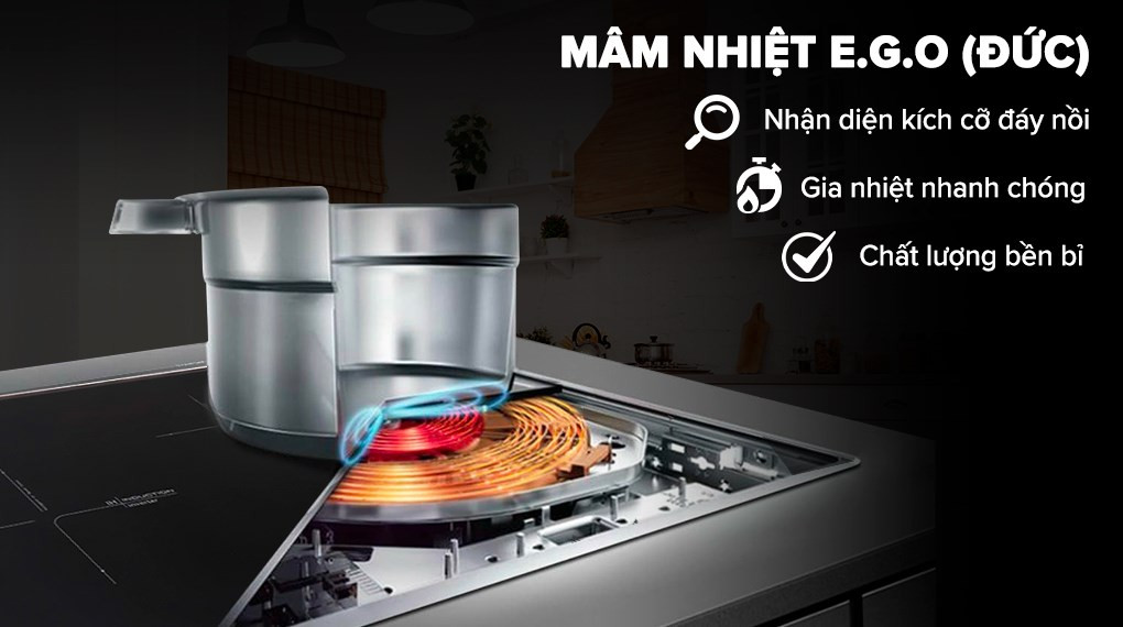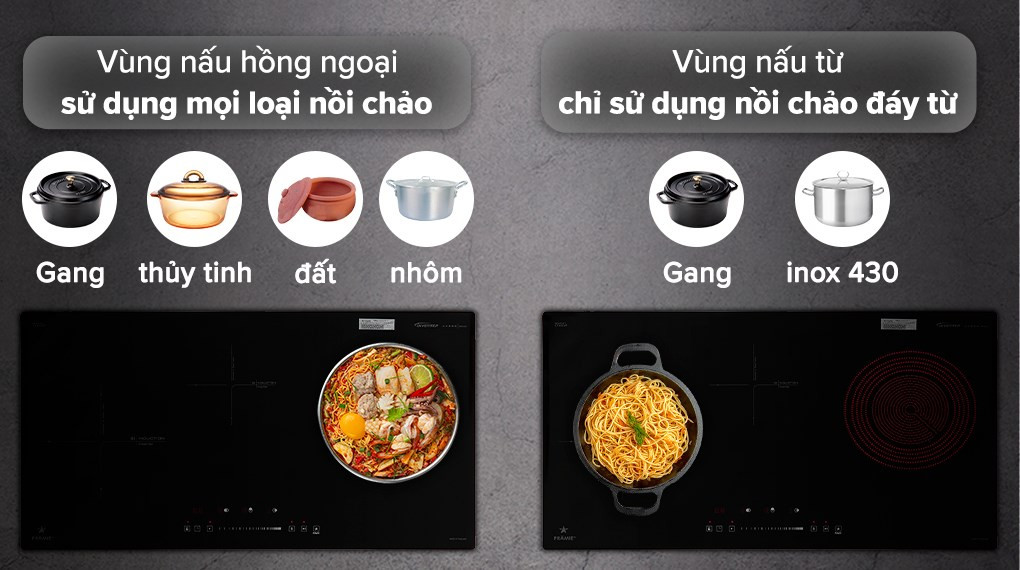 - Vùng bếp hồng ngoại dùng được với mọi nồi, chảo chất liệu từ thủy tinh, nhôm, inox, gang đến đất.