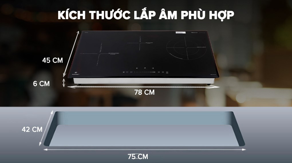- Kích thước vùng nấu: Từ (Trái) Ø 18 cm - Từ (Phải) Ø 11 cm - Hồng ngoại Ø 22 cm.