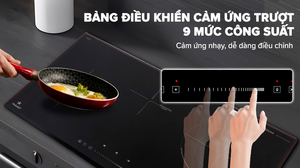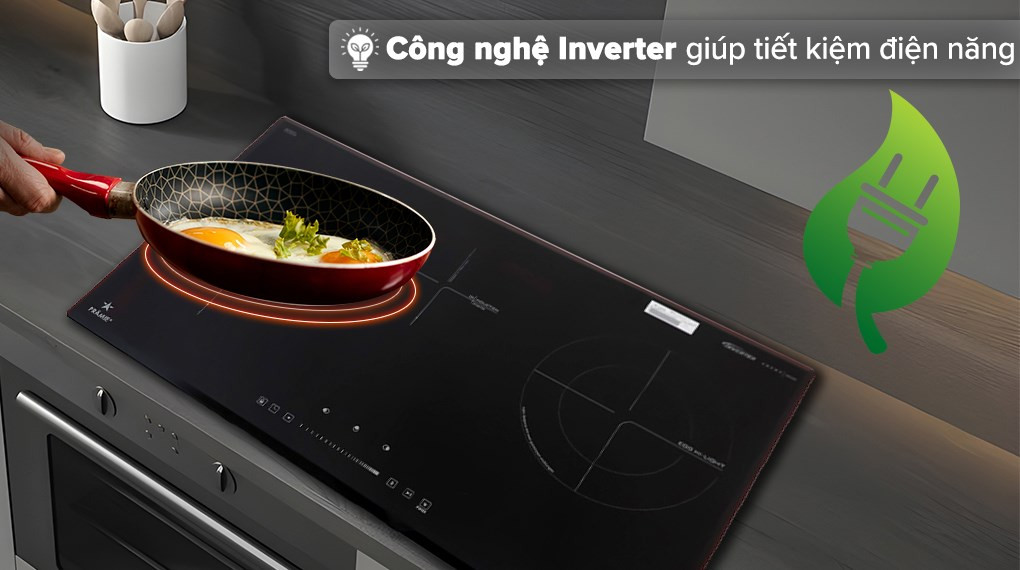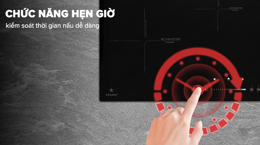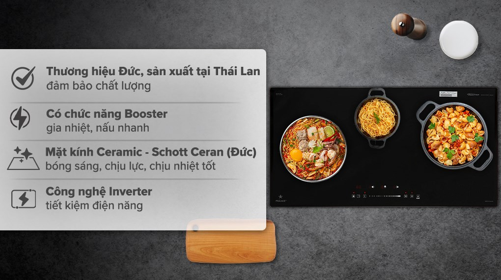 - Bếp từ Pramie có tổng công suất 5000W, trang bị tính năng Booster làm nóng nhanh, nấu ăn tiết kiệm thời gian.