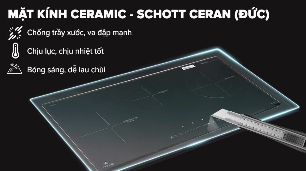 - Mặt bếp được làm từ kính Ceramic - Schott Ceran (Đức) chịu lực, chịu nhiệt tốt. Chất liệu sáng bóng dễ lau chùi, khả năng chống trầy xước tốt, ổn định hiệu suất đun nấu trong suốt thời gian sử dụng.