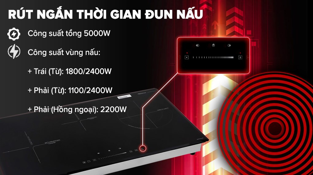 - Công suất mỗi vùng nấu: Từ (Trái) 1800/2400W - Từ (Phải) 1100/2400W - Hồng ngoại 2200W.