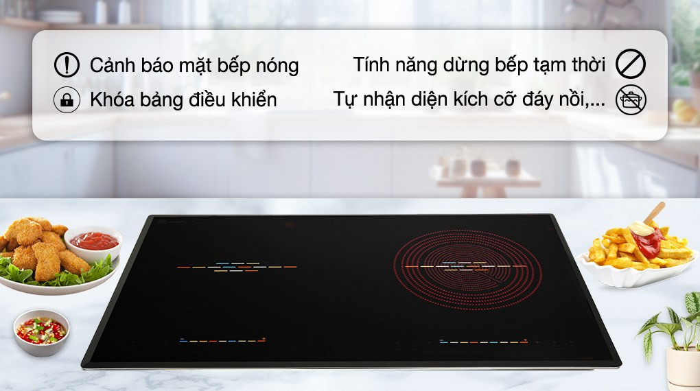 - Nếu mặt bếp vùng bếp từ nếu trên 80°C, vùng hồng ngoại phù thuộc vào thời gian làm việc thì sẽ xuất hiện cảnh báo mặt bếp nóng giúp người nhận ra mặt bếp còn đang nóng và không chạm tay vào.