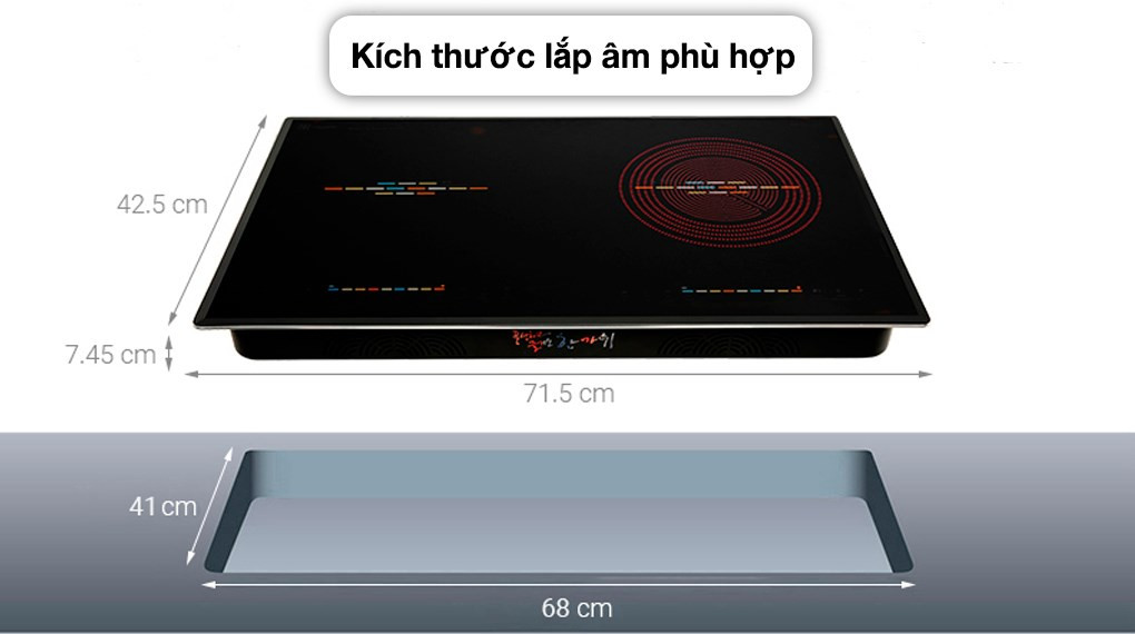 - Kích thước vùng nấu: Trái Ø 19 cm - Phải Ø 19 cm.