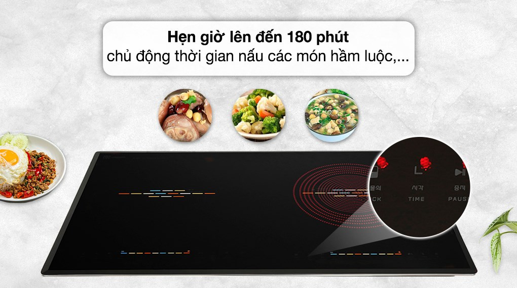 - Có hẹn giờ lên đến 180 phút tiện nấu các món ninh hầm mà không cần canh chừng tắt bếp. Đặc biệt khi kích hoạt tính năng này thì đồng thời tự ngắt khi bếp nóng quá tải và tự ngắt khi nước tràn đến bảng điều khiển cũng hoạt động ở mức cao hơn. Vậy nên hoàn toàn có thể yên tâm về tính an toàn trong suốt quá trình hẹn giờ nấu.