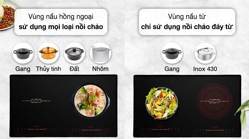 - Vùng bếp hồng ngoại dùng được với mọi nồi, chảo chất liệu từ thủy tinh, nhôm, inox, gang đến đất.