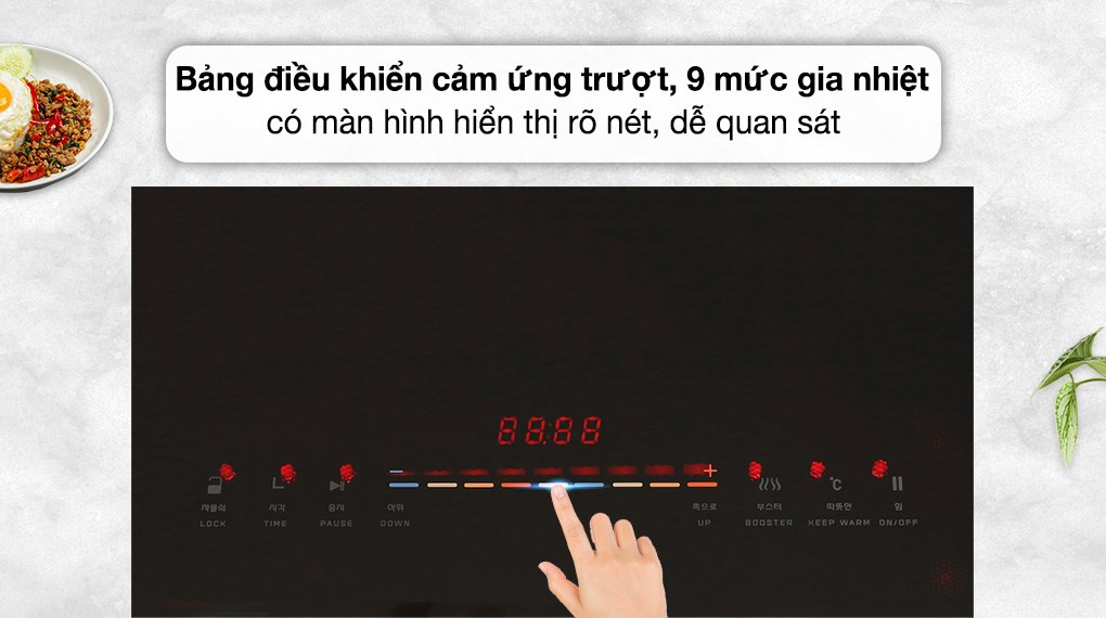 - Bảng điều khiển cảm ứng trượt riêng biệt với 9 mức gia nhiệt