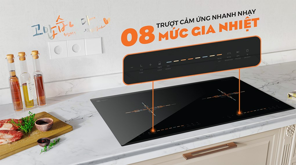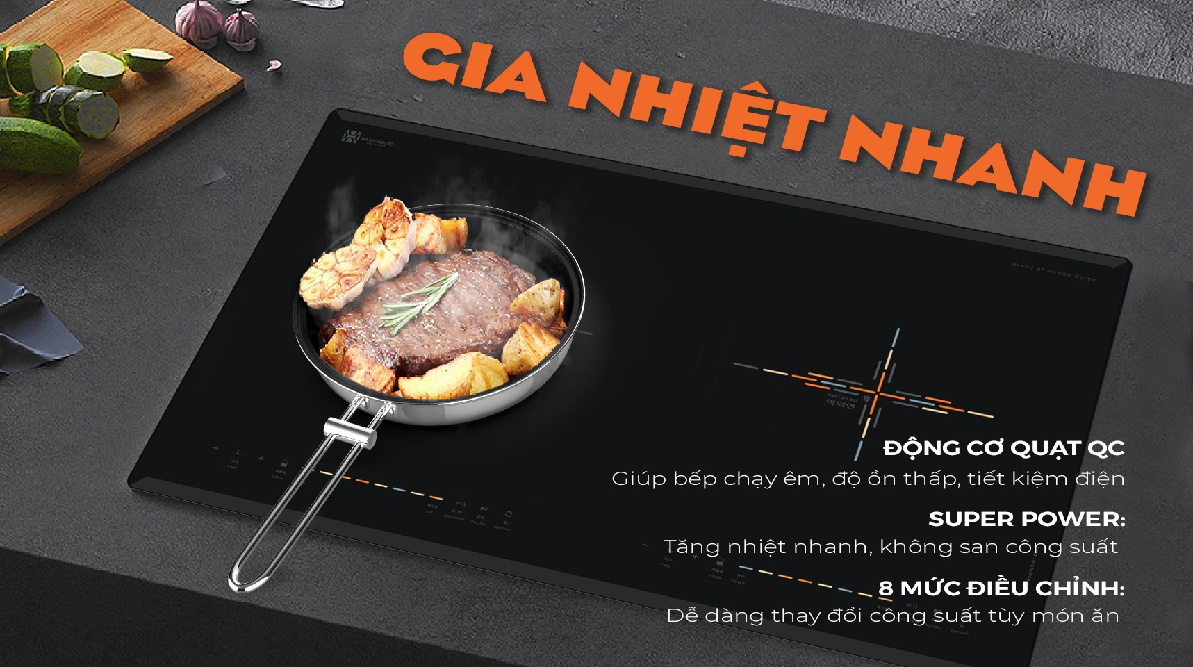 - Vùng từ (trái): 1700/1900W, vùng hồng ngoại (phải): 1700/1900W. Vùng hồng ngoại có thể tùy chọn vòng nhiệt lớn/nhỏ phù hợp với kích thước đáy nồi, chảo sử dụng để hạn chế thất thoát nhiệt.