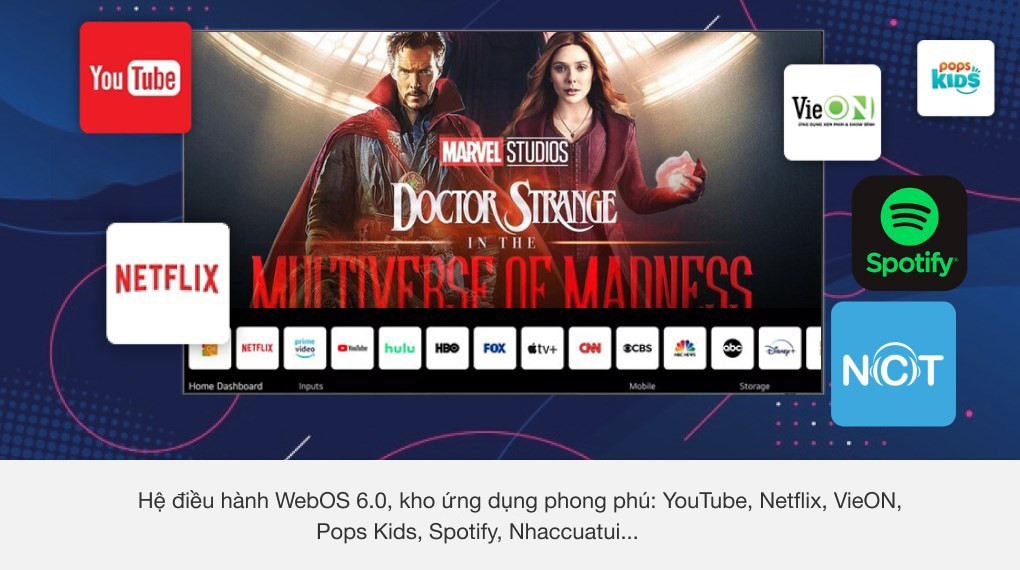 Giao diện WebOS 6.0 được sắp xếp gọn gàng, kho ứng dụng cũng được bổ sung nhiều hơn, cho giải trí đa dạng hơn: YouTube, Netflix, Trình duyệt web, MyTV, Nhaccuatui, Clip TV, FPT Play, ZingTV, Spotify,...