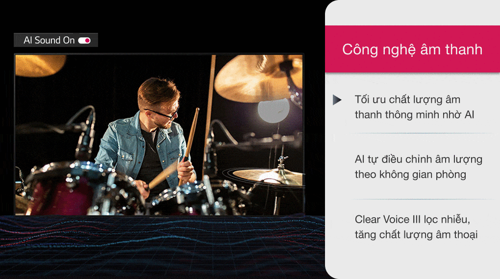 Điều chỉnh âm thanh cho phù hợp với từng không gian sử dụng nhờ AI Sound và AI Acoustic Tuning với khả năng phân tích vị trí và khoảng cách giữa người sử dụng và thiết bị từ đó điều chỉnh âm thanh cho phù hợp bằng cách lấy các âm thanh bị mất từ kho 17 triệu điểm dữ liệu âm thanh.