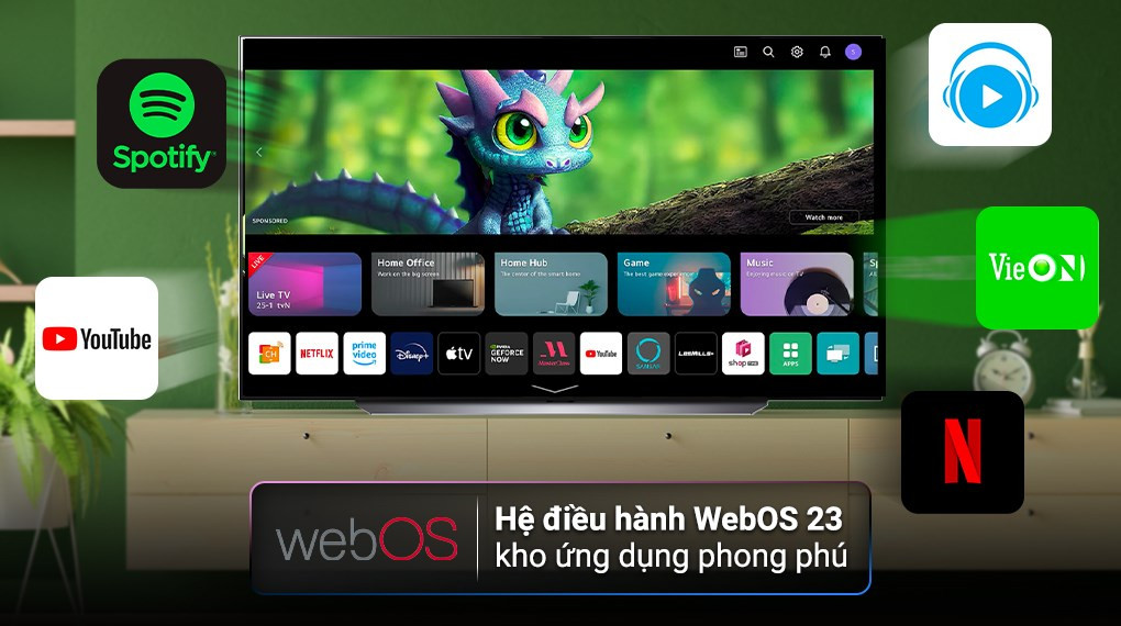 - Giao diện hệ điều hành WebOS 23 được thiết kế thân thiện, bạn có thể tìm kiếm, truy cập vào các nội dung yêu thích nhanh chóng, tạo được tài khoản cá nhân để có trải nghiệm không gian giải trí thuộc về riêng bạn.